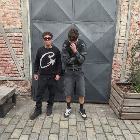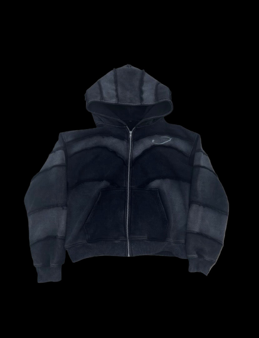 This hoodie features a washed black, distressed look with bold paneled stitching and exposed seams. It has a full front zip, dual pockets, and a large multi-panel hood. The design is futuristic and rugged, with a sleek swirl logo on the chest- perfect for a tech wear for streetwear drop.